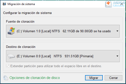 ② En la ventana que se muestra, seleccione el disco donde se encuentra el sistema de Windows y el disco duro de destino. Luego, haga clic en Migrar para empezzar la transferencia de Windows.